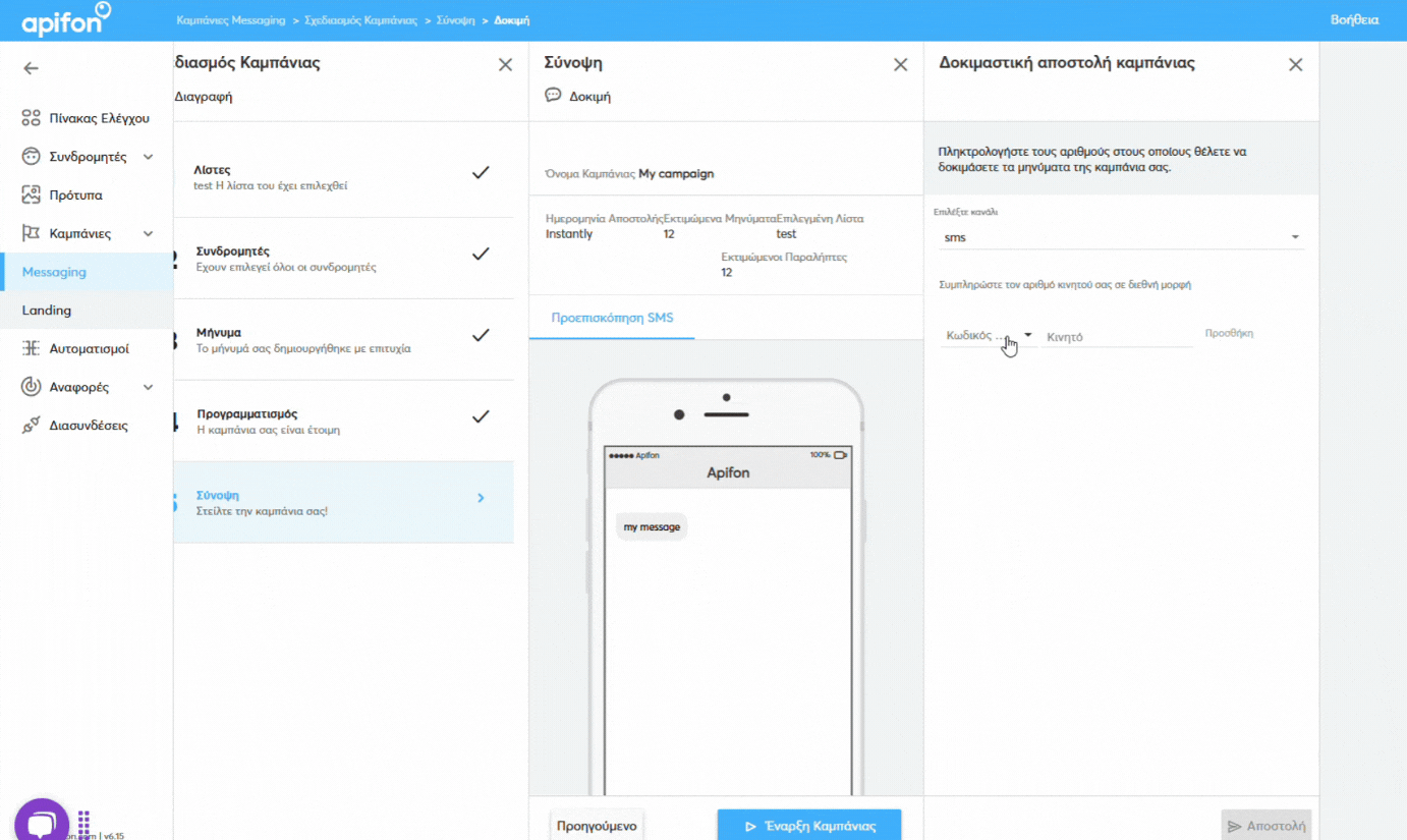 Πριν αποστείλετε την καμπάνια σας, μπορείτε να στείλετε ένα δοκιμαστικό μήνυμα στο κινητό σας ή σε μια ομάδα αριθμών, ακολουθώντας τα εξής βήματα:
